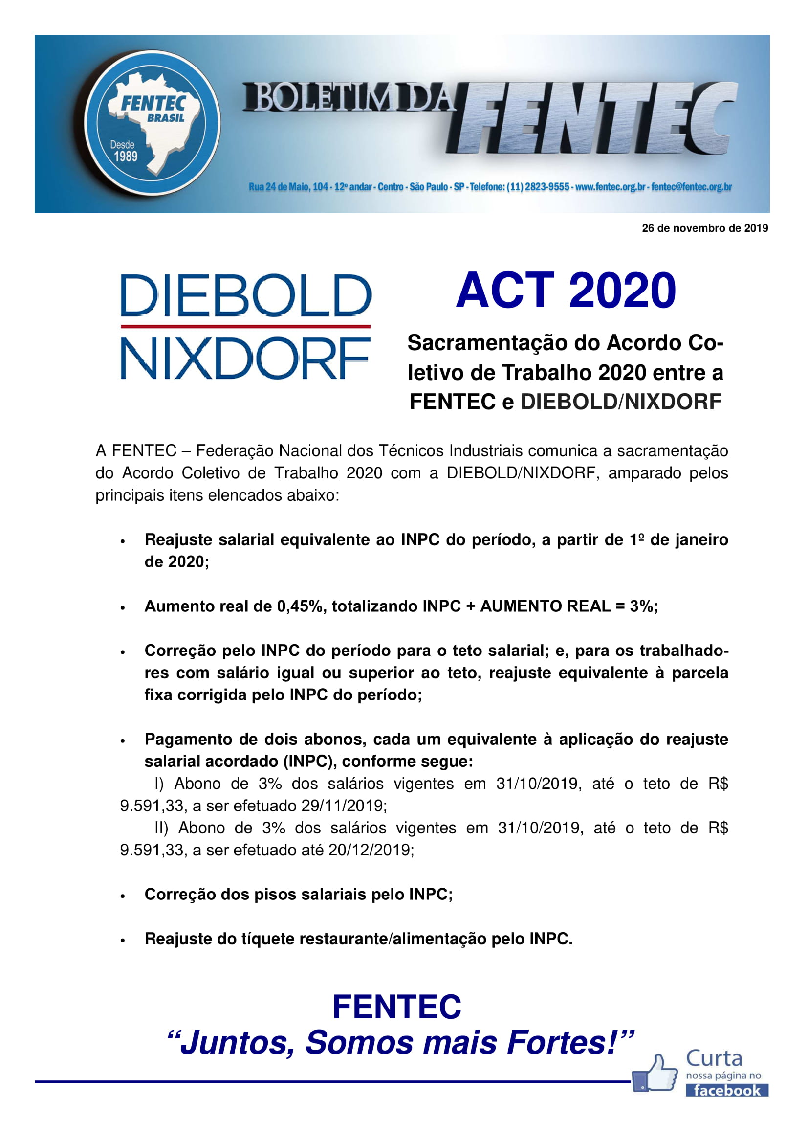 SACRAMENTAÇÃO DO ACORDO COLETIVO ENTRE A FENTEC E DIEBOLD/NIXDORF